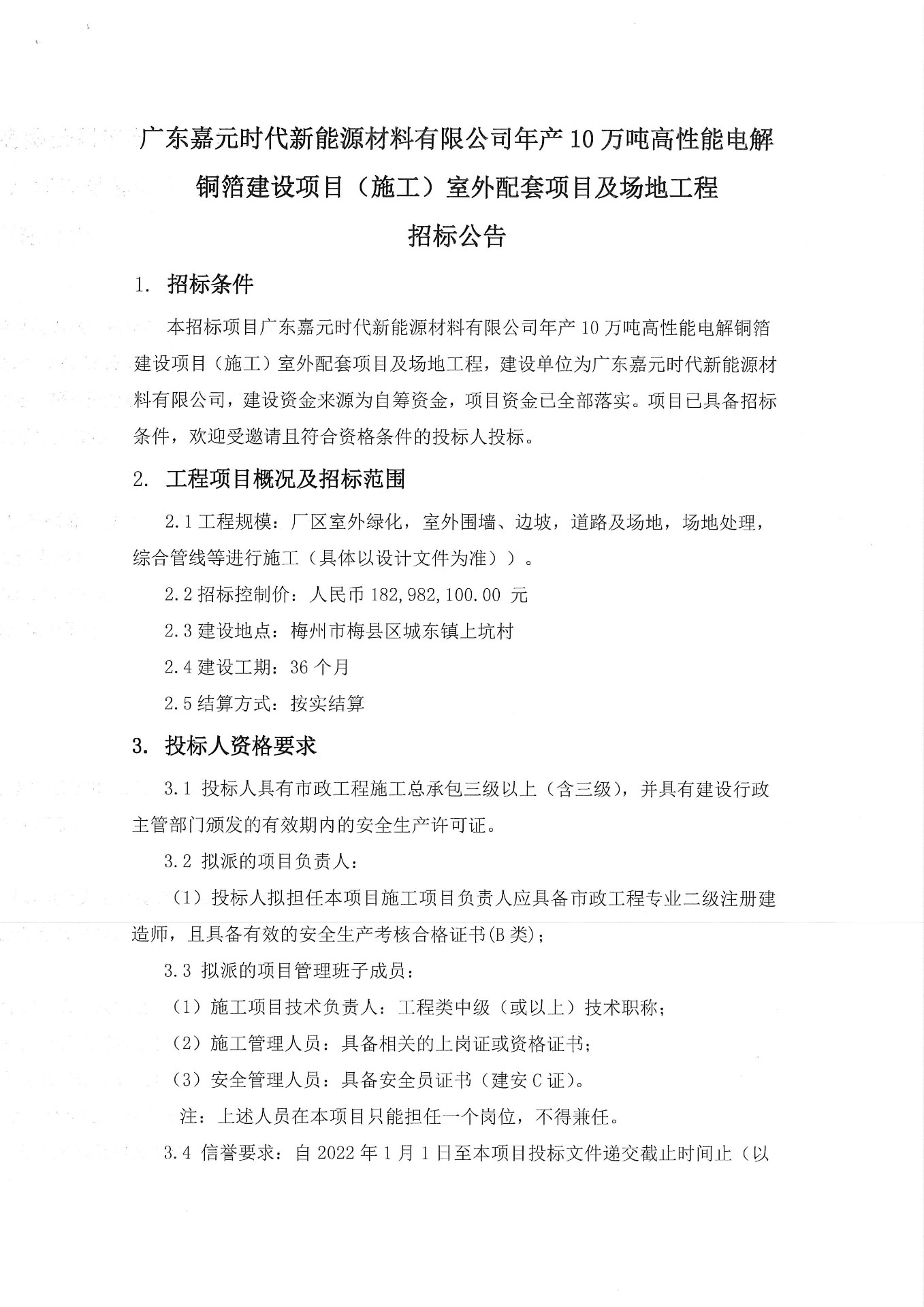廣東嘉元時(shí)代新能源材料有限公司年產(chǎn)10萬(wàn)噸高性能電解銅箔建設(shè)項(xiàng)目(施工)室外配套項(xiàng)目及場(chǎng)地工程招標(biāo)公告