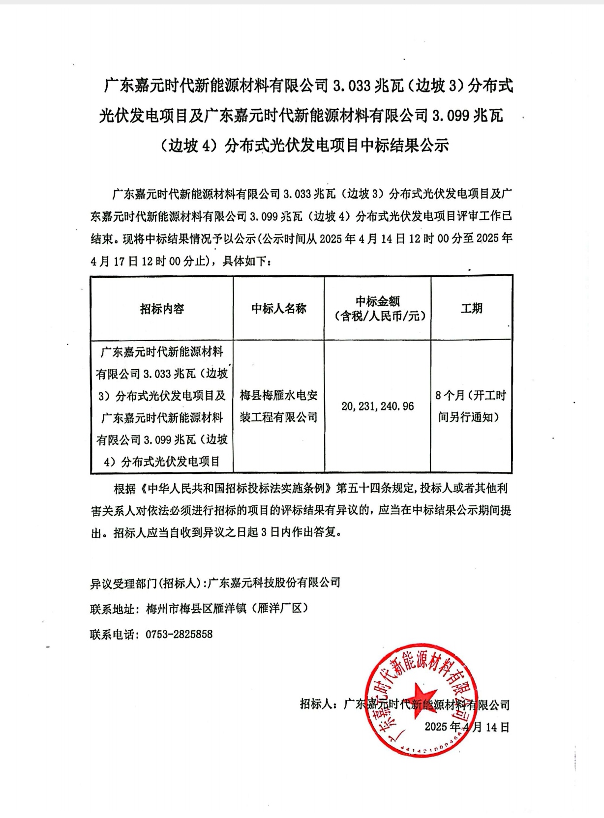 《廣東嘉元時(shí)代新能源材料有限公司3.033兆瓦(邊坡3)分布式光伏發(fā)電項(xiàng)目及廣東嘉元時(shí)代新能源材料有限公司3.099兆瓦 (邊坡4)分布式光伏發(fā)電項(xiàng)目中標(biāo)結(jié)果公示》